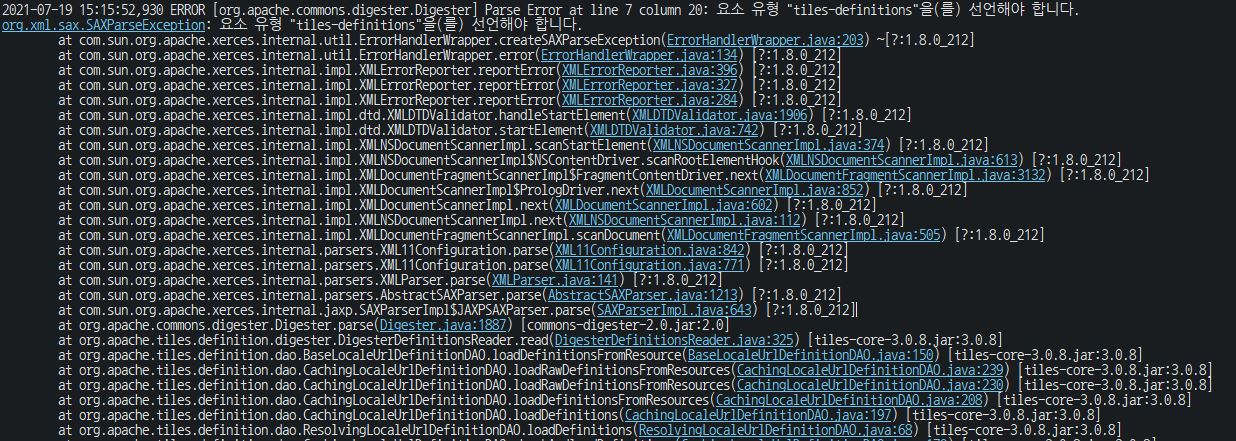 org.xml.sax.SAXParseException: 요소 유형 "tiles-definitions" 을(를) 선언해야 합니다.